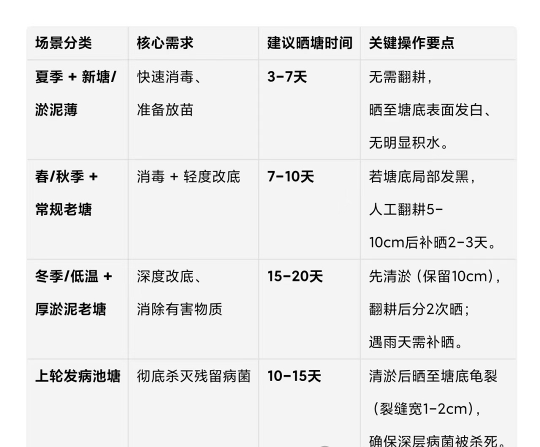 /秋季(15-25℃):温度适中,需7-10天,若塘底发黑需翻耕后补晒2-3天。